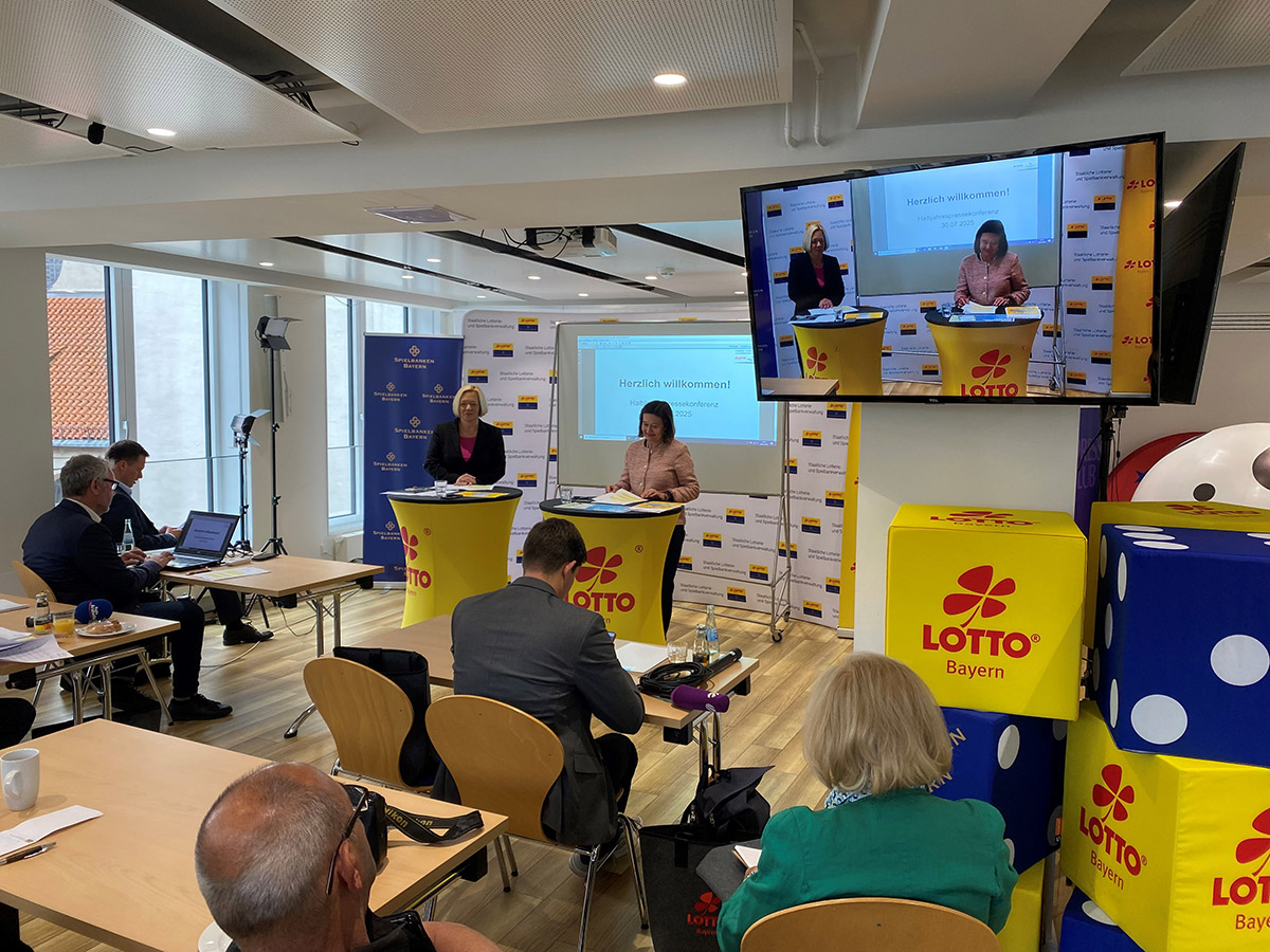 Für Stunden verwandelten sich die Räume des PresseClubs am Marienplatz in einen veritablen Spielsalon oder eine Lotto-Annahmestelle. So viele Aufsteller, Pulte und Sitzwürfel mit dem Kleeblatt-und Spielbanken-Logo hatte Dr. Carolin Kerschbaumer, seit März neue Präsidentin der Staatlichen Lotterie- und Spielbankverwaltung, mitgebracht. Sie zog bei der Bilanz-Pressekonferenz ein positives Resumee des ersten Halbjahrs 2025. Bereits 300 Millionen Euro konnten in Bayern an Gewinnen ausgeschüttet werden, 256 Millionen flossen für die verschiedensten sozialen, sportlichen und ökologischen Projekte in den Staatshaushalt. Highlight war ein Eurojackpot-Gewinn von knapp 40,7 Millionen Euro. Den bekam ein Spielteilnehmer aus dem Großraum München im Juni überwiesen. Über 353-tausend Gäste besuchten die neun bayerischen Spielbanken.